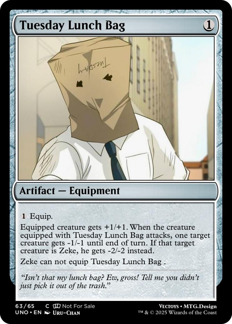 Equipped creature gets +1/+1. When the creature equipped with Tuesday Lunch Bag attacks, one target creature gets -1/-1 until end of turn. If that target creature is Zeke, he gets -2/-2 instead.