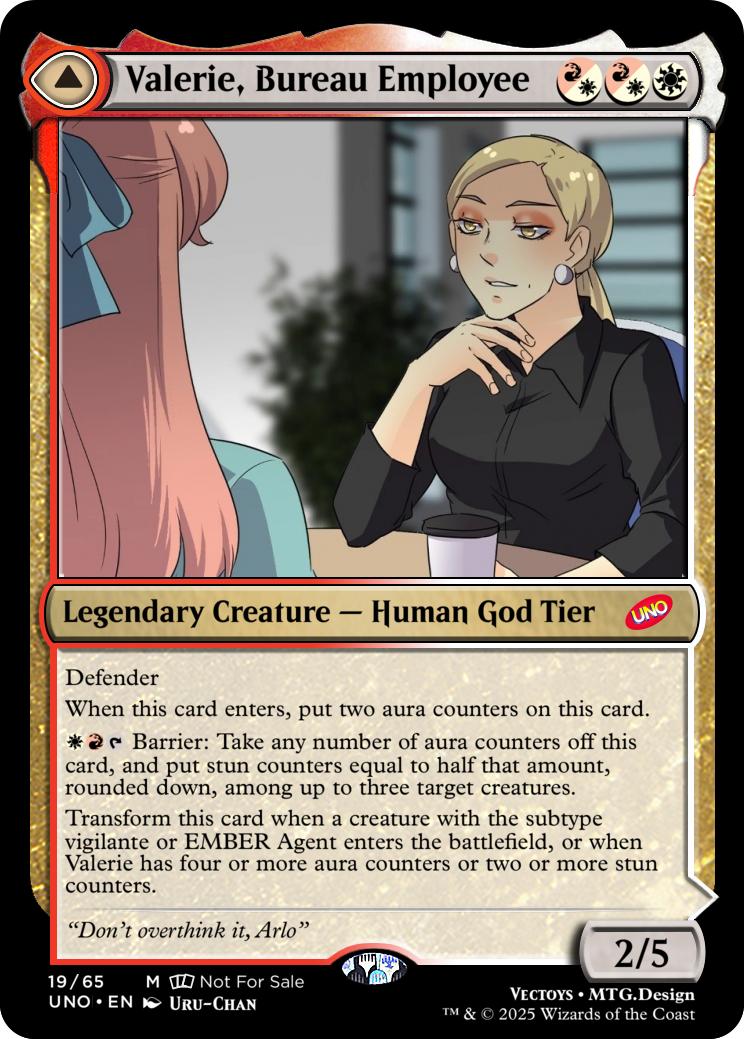 Transform this card when a creature with the subtype vigilante or EMBER Agent enters the battlefield, or when Valerie has four or more aura counters or two or more stun counters.