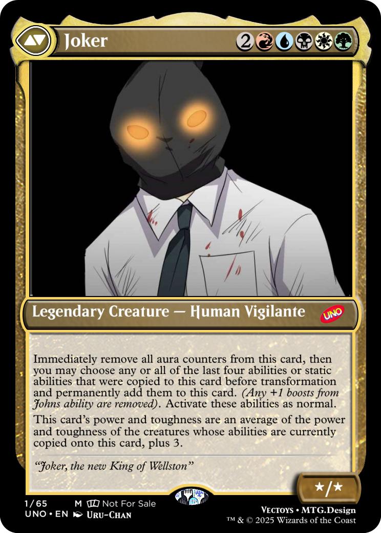 If Joker is in play when this card enters, exile this card, then you may add {X} (Where X is the amount of mana used to play William)+1/+1 counters to Joker; if you do so, remove one ability or static ability from Joker permanently.