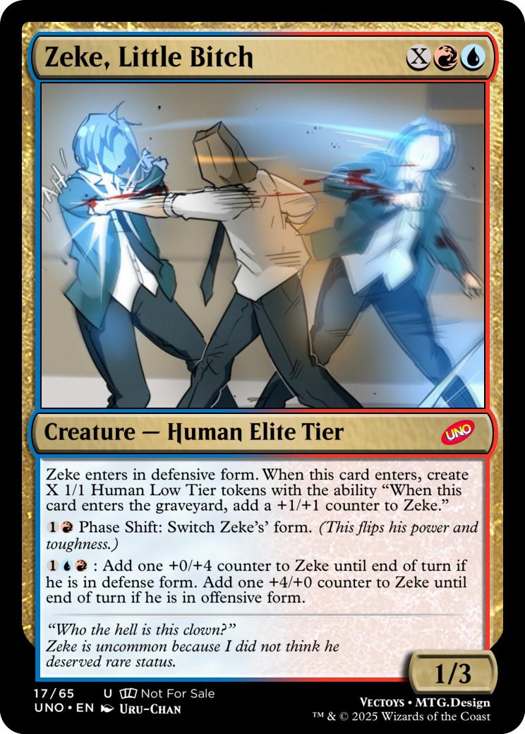 {1}{R} Phase Shift: Switch Zeke's' form. (This flips his power and toughness.)