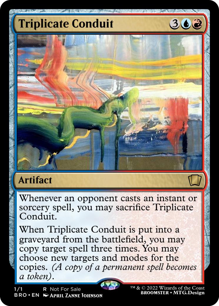 When Triplicate Conduit is put into a graveyard from the battlefield, you may copy target spell three times. You may choose new targets and modes for the copies. (A copy of a permanent spell becomes a token).