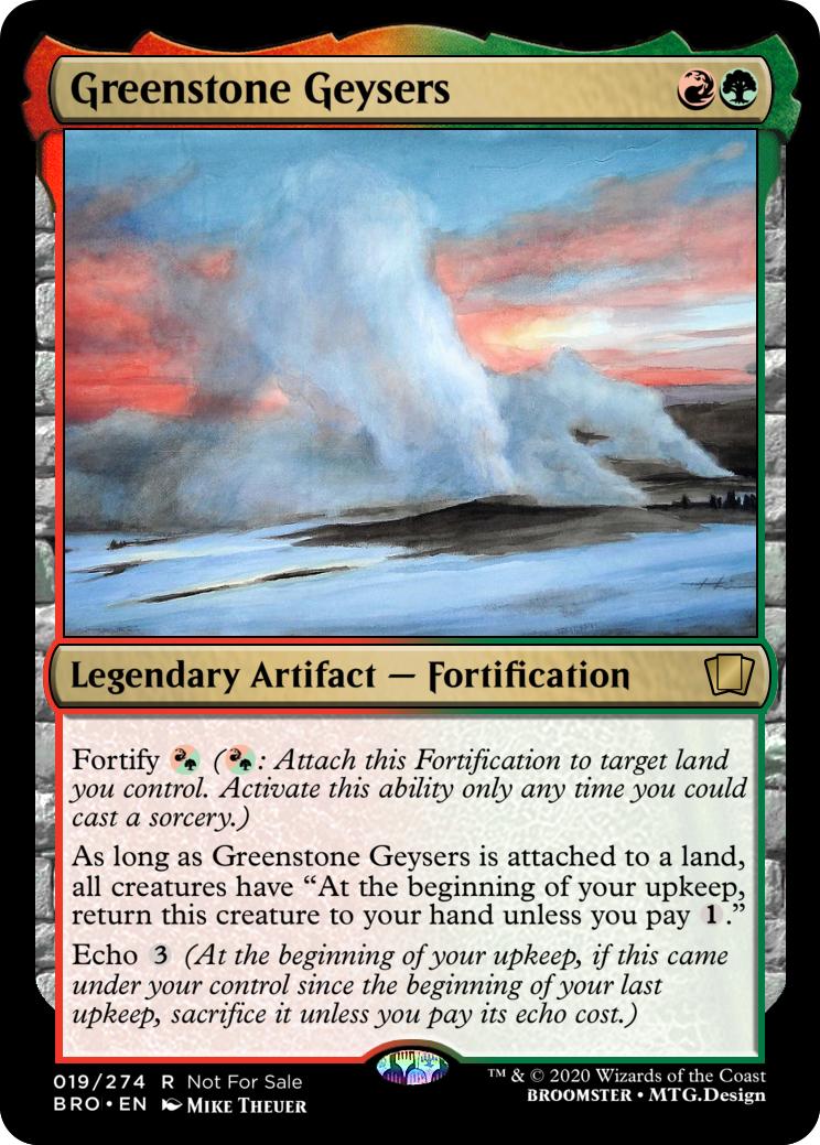 As long as Greenstone Geysers is attached to a land, all creatures have "At the beginning of your upkeep, return this creature to your hand unless you pay {1}."