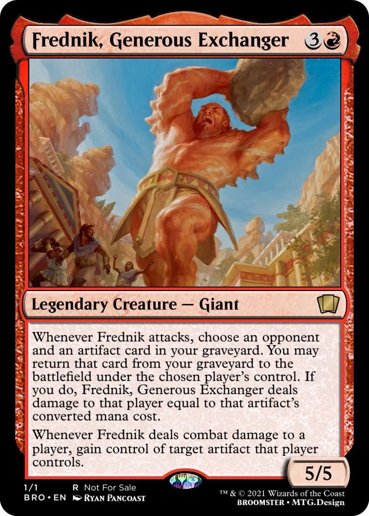 Whenever Frednik attacks, choose an opponent and an artifact card in your graveyard. You may return that card from your graveyard to the battlefield under the chosen player's control. If you do, Frednik, Generous Exchanger deals damage to that player equal to that artifact's converted mana cost.
