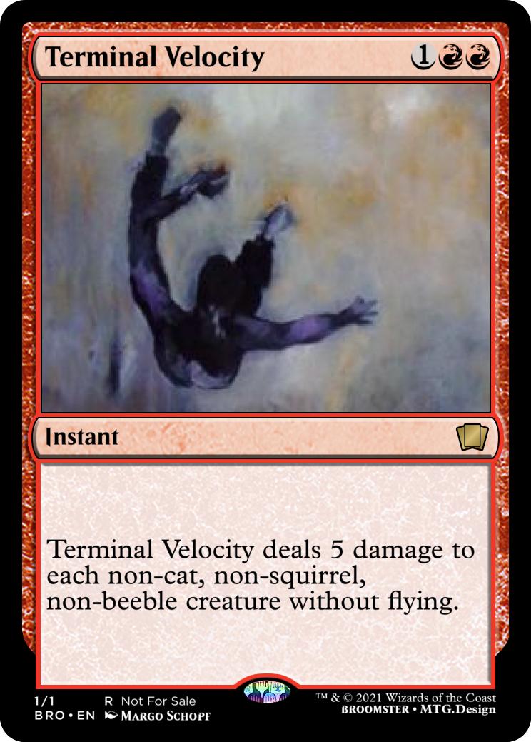 Terminal Velocity deals 5 damage to each non-cat, non-squirrel, non-beeble creature without flying.
