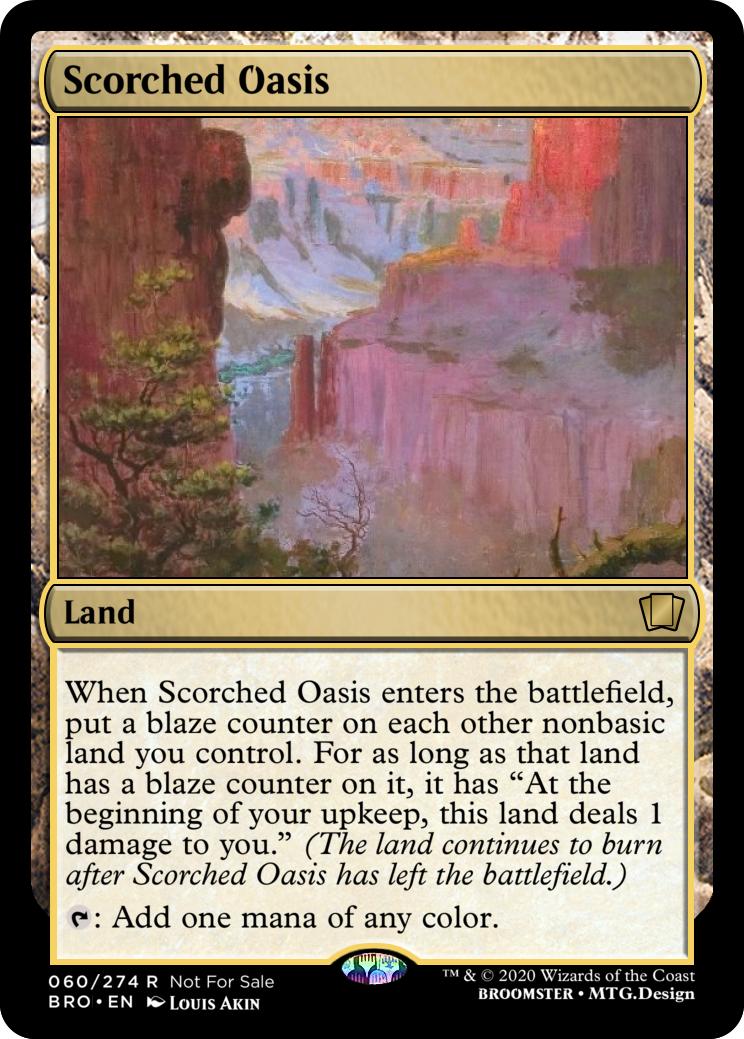 When Scorched Oasis enters the battlefield, put a blaze counter on each other nonbasic land you control. For as long as that land has a blaze counter on it, it has "At the beginning of your upkeep, this land deals 1 damage to you." (The land continues to burn after Scorched Oasis has left the battlefield.)