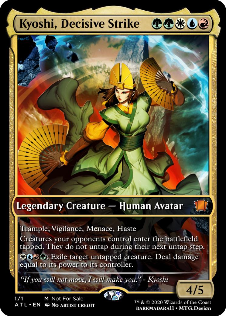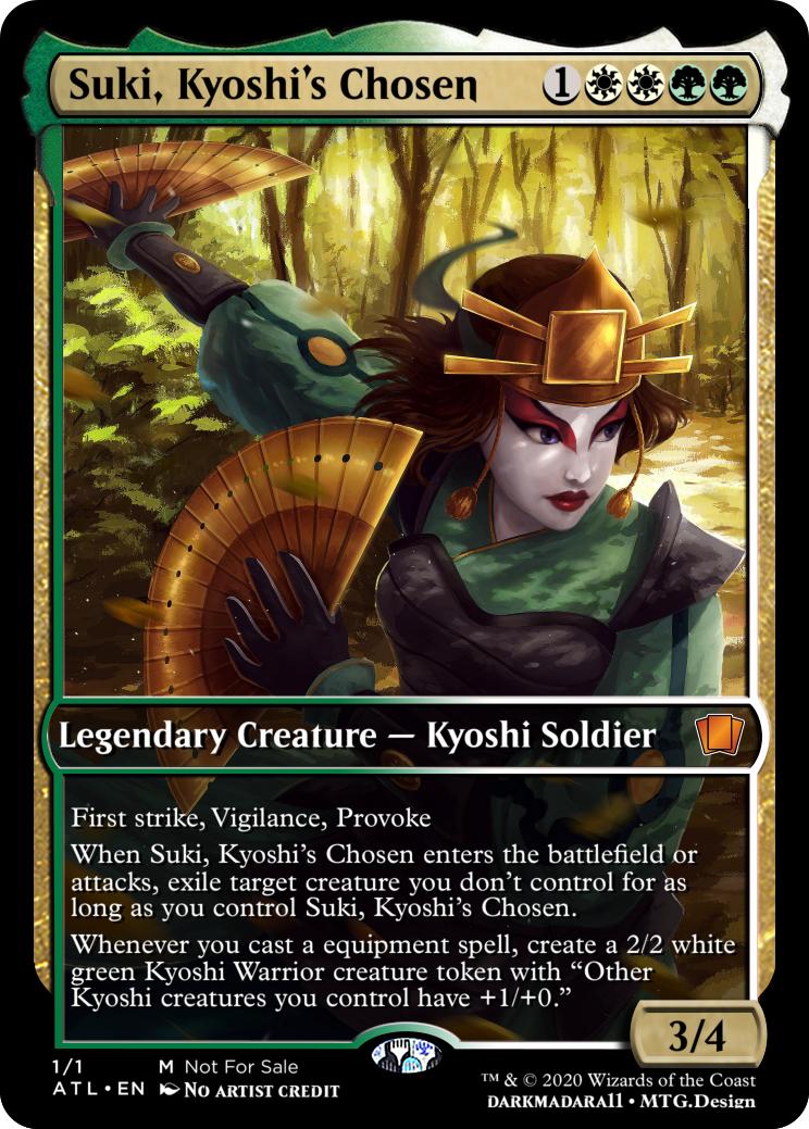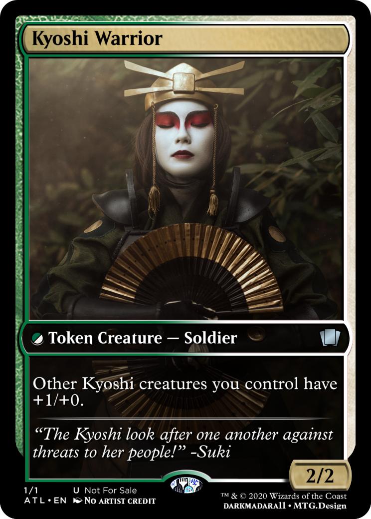 Whenever you cast a equipment spell, create a 2/2 white green Kyoshi Warrior creature token with "Other Kyoshi creatures you control have +1/+0."