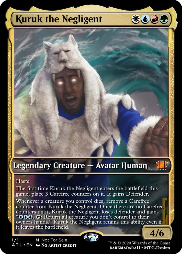 The first time Kuruk the Negligent enters the battlefield this game, place 3 Carefree counters on it. It gains Defender.