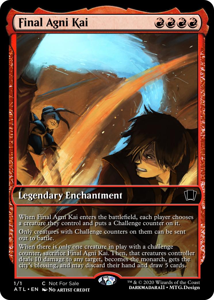 When there is only one creature in play with a challenge counter, sacrifice Final Agni Kai. Then, that creatures controller deals 10 damage to any target, becomes the monarch, gets the city's blessing, and may discard their hand and draw 5 cards.
