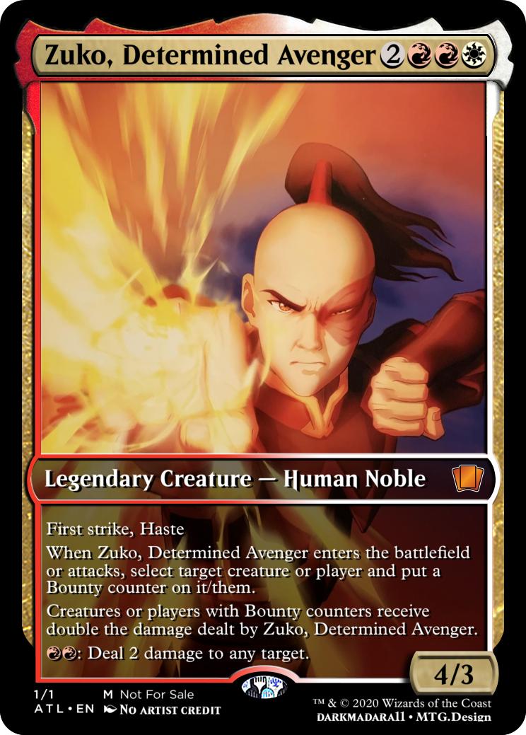 Creatures or players with Bounty counters receive double the damage dealt by Zuko, Determined Avenger.