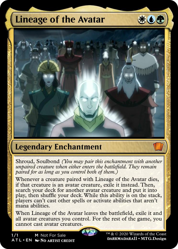 Whenever a creature paired with Lineage of the Avatar dies, if that creature is an avatar creature, exile it instead. Then, search your deck for another avatar creature and put it into play, then shuffle your deck. While this ability is on the stack, players can't cast other spells or activate abilities that aren't mana abilities.