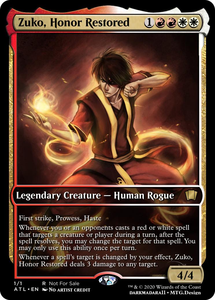 Whenever a spell's target is changed by your effect, Zuko, Honor Restored deals 3 damage to any target.