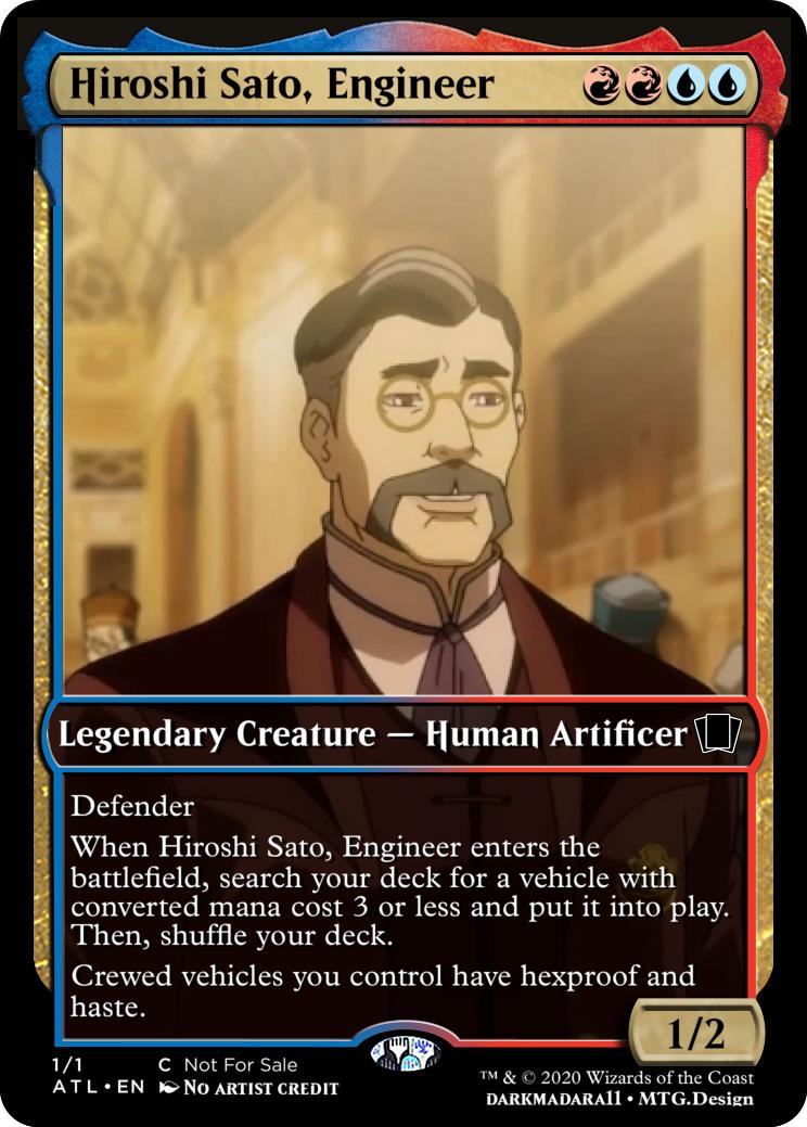 When Hiroshi Sato, Engineer enters the battlefield, search your deck for a vehicle with converted mana cost 3 or less and put it into play. Then, shuffle your deck.