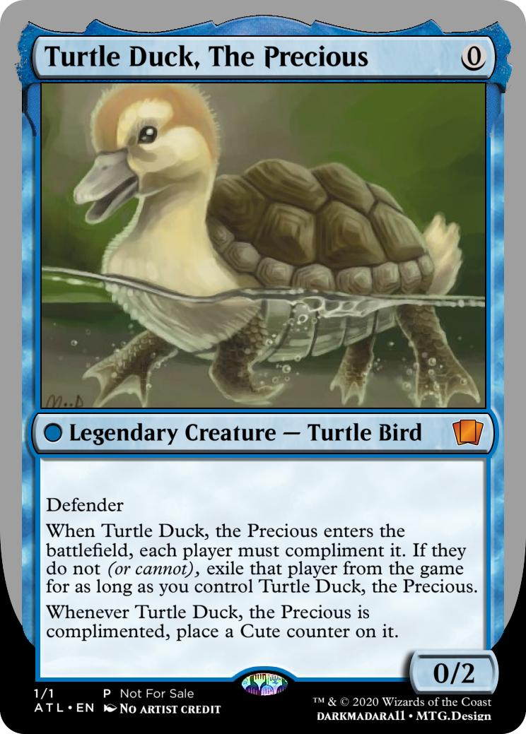 When Turtle Duck, the Precious enters the battlefield, each player must compliment it. If a player does not (or cannot), exile that player from the game for as long as you control Turtle Duck, the Precious.