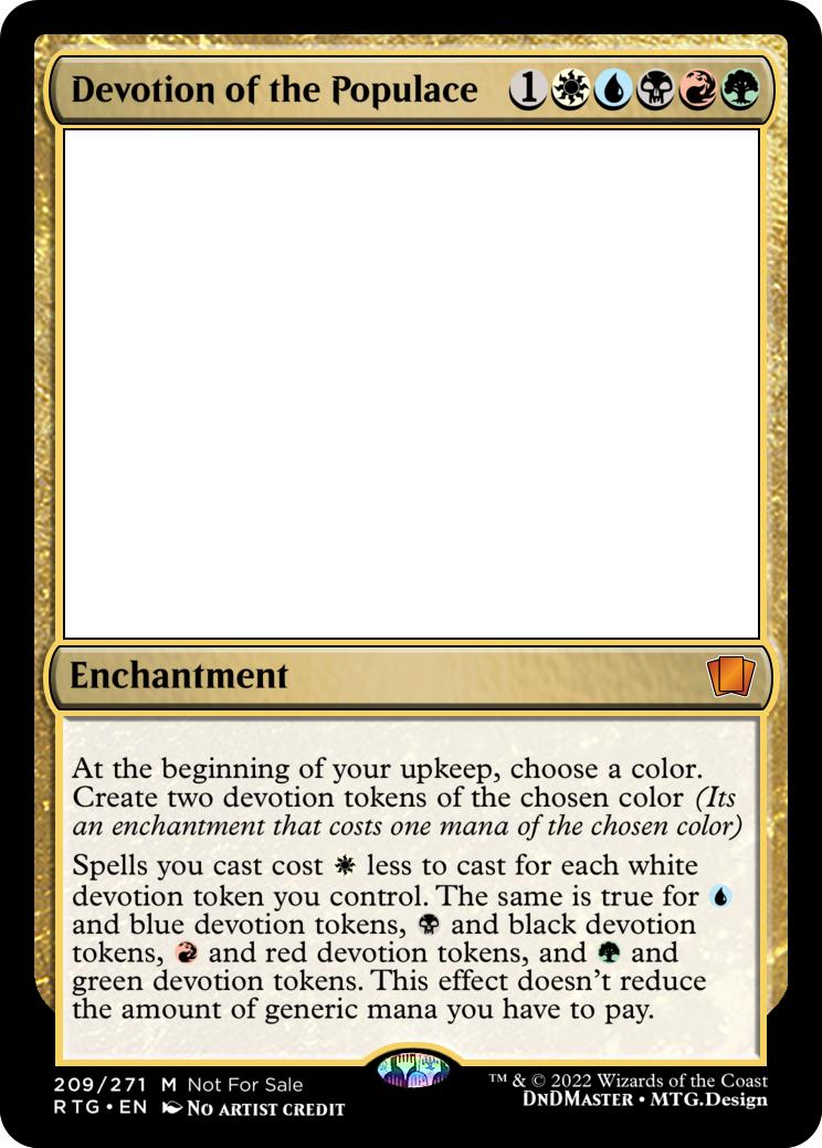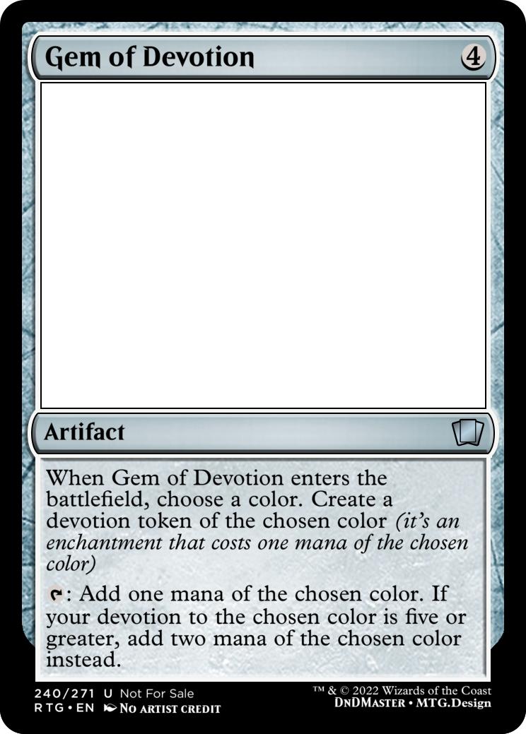 When Gem of Devotion enters the battlefield, choose a color. Create a devotion token of the chosen color (it’s an enchantment that costs one mana of the chosen color)