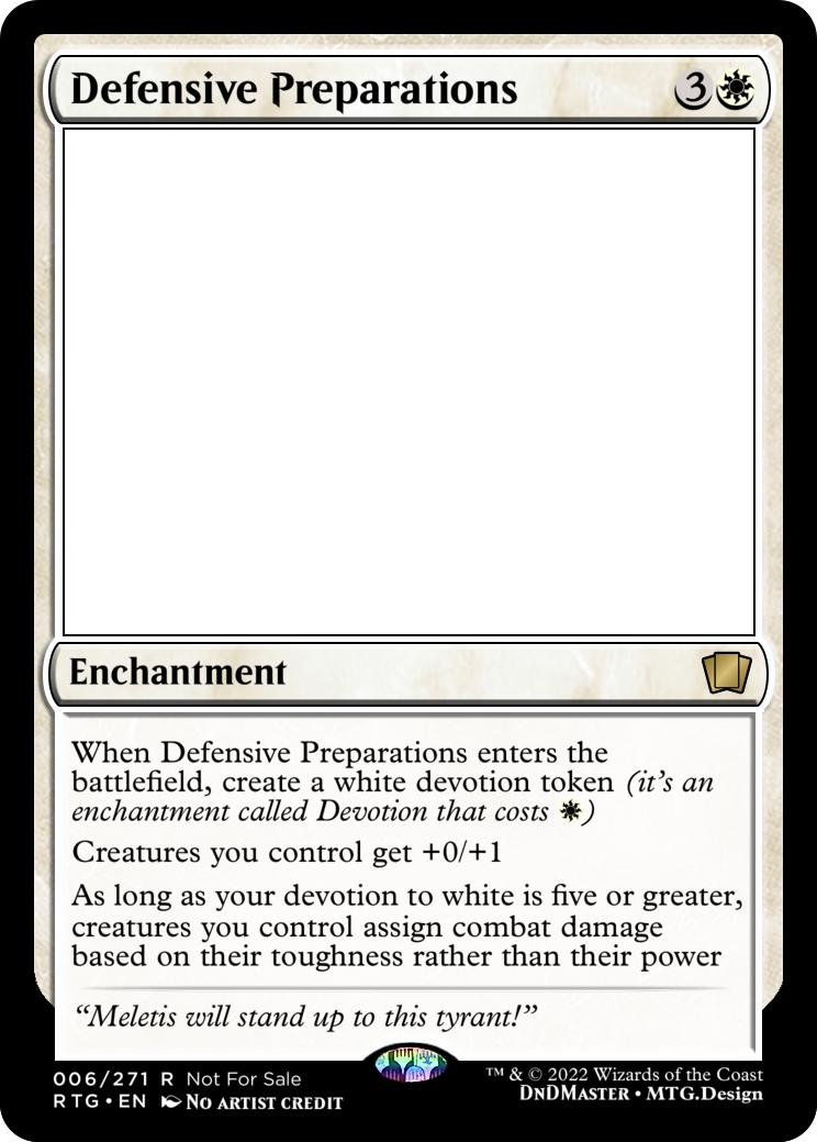 When Defensive Preparations enters the battlefield, create a white devotion token (it’s an enchantment called Devotion that costs {w})
