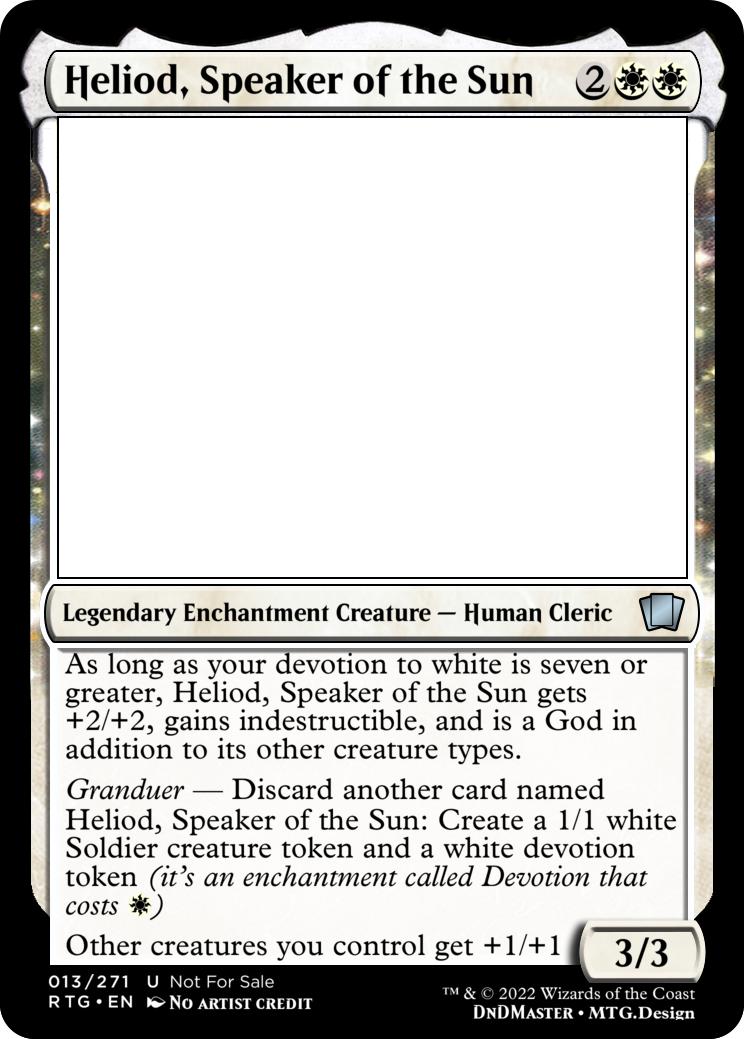 Granduer - Discard another card named Heliod, Speaker of the Sun: Create a 1/1 white Soldier creature token and a white devotion token (it’s an enchantment called Devotion that costs {w})