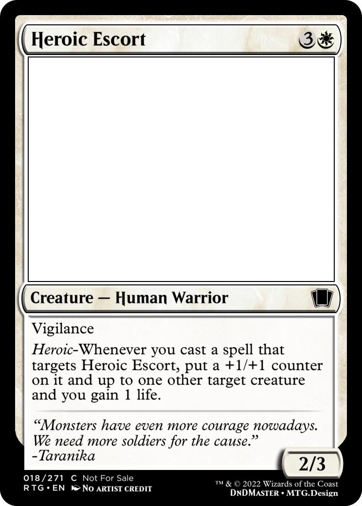 Heroic-Whenever you cast a spell that targets Heroic Escort, put a +1/+1 counter on it and up to one other target creature and you gain 1 life.