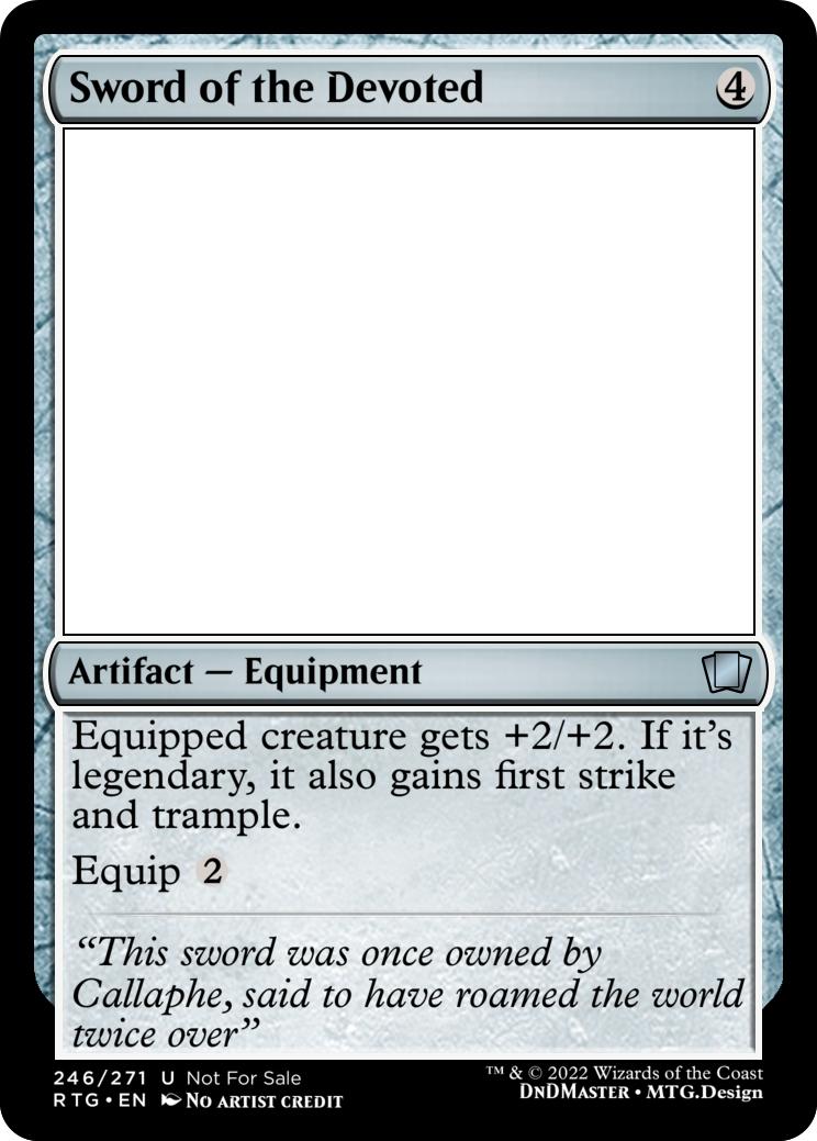 Equipped creature gets +2/+2. If it’s legendary, it also gains first strike and trample.