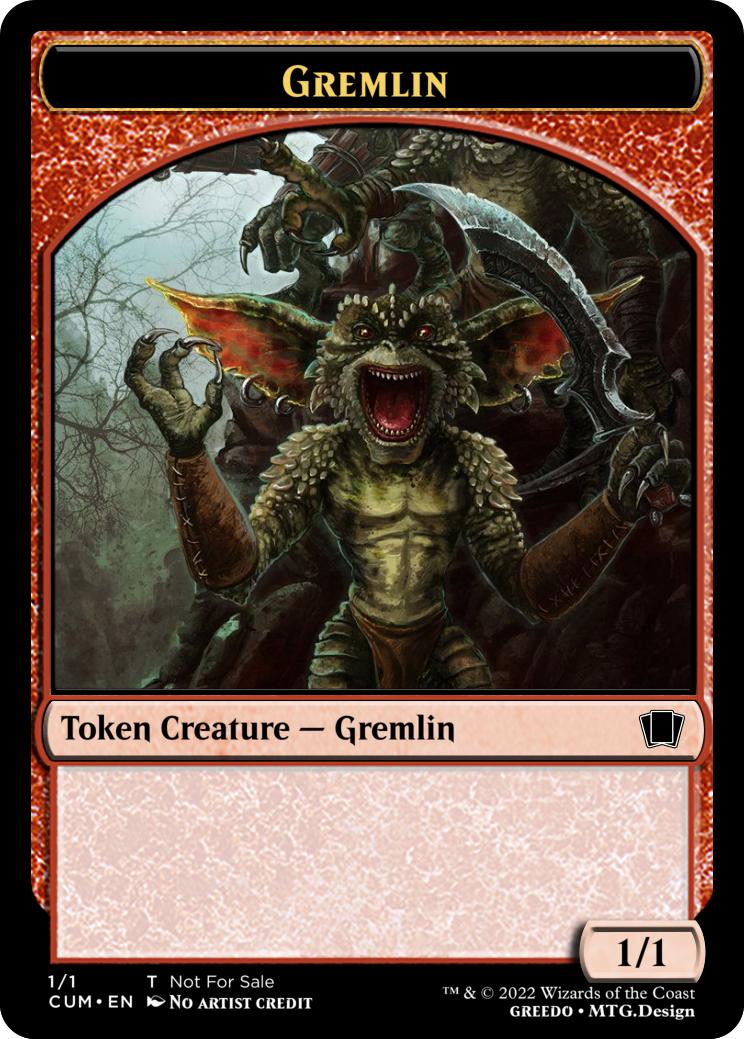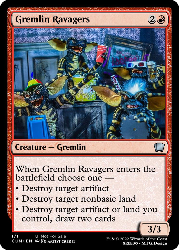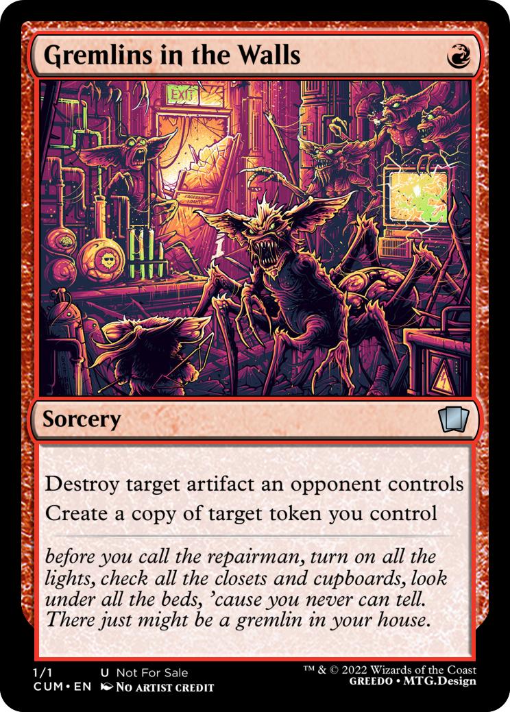 Gremlins you control gain "Whenever this creature deals combat damage to a player, you may destroy an artifact or reveal the top card of an opponents library. If the revealed card is an artifact, put it onto the battlefield under your control." until end of turn.