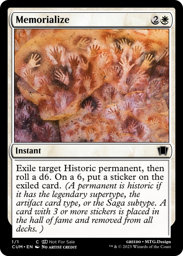 Exile target Historic permanent, then roll a d6. On a 6, put a sticker on the exiled card. (A permanent is historic if it has the legendary supertype, the artifact card type, or the Saga subtype. A card with 3 or more stickers is placed in the hall of fame and removed from all decks. )