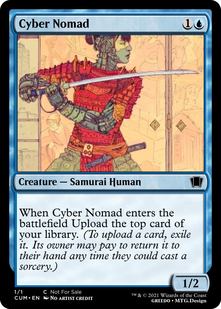 When Cyber Nomad enters the battlefield Upload the top card of your library. (To upload a card, exile it. Its owner may pay to return it to their hand any time they could cast a sorcery.)