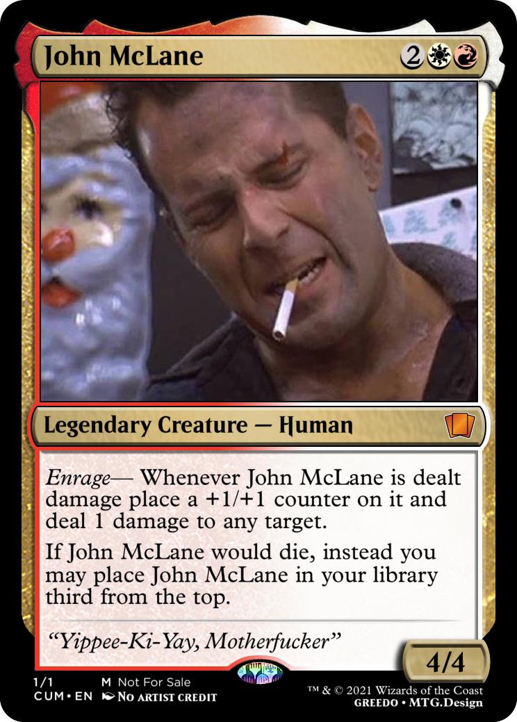 Enrage- Whenever John McLane is dealt damage place a +1/+1 counter on it and deal 1 damage to any target.