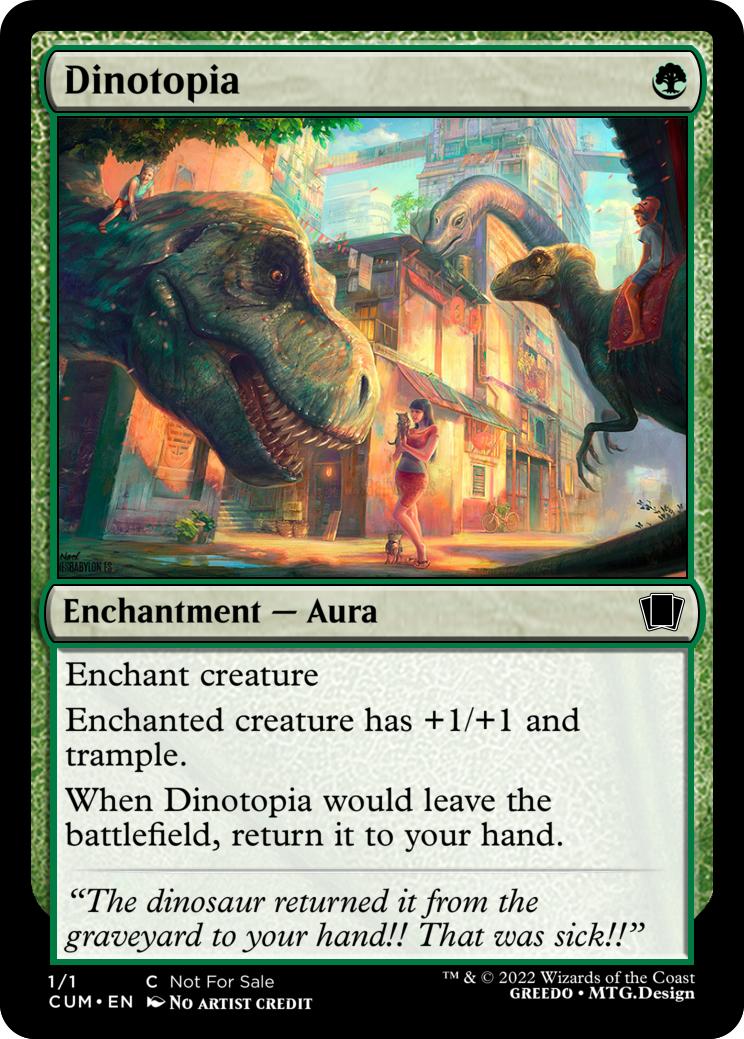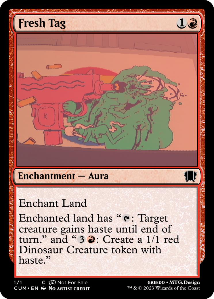 Enchanted land has "{T}: Target creature gains haste until end of turn." and "{3}{R}: Create a 1/1 red Dinosaur Creature token with haste."