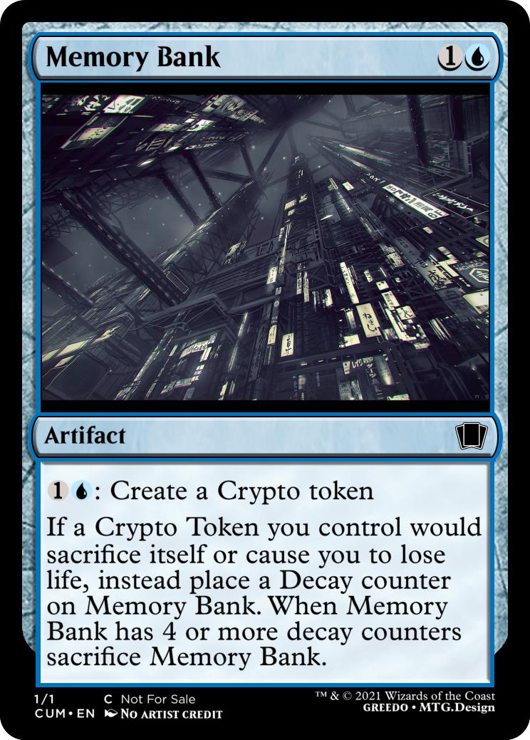 If a Crypto Token you control would sacrifice itself or cause you to lose life, instead place a Decay counter on Memory Bank. When Memory Bank has 4 or more decay counters sacrifice Memory Bank.