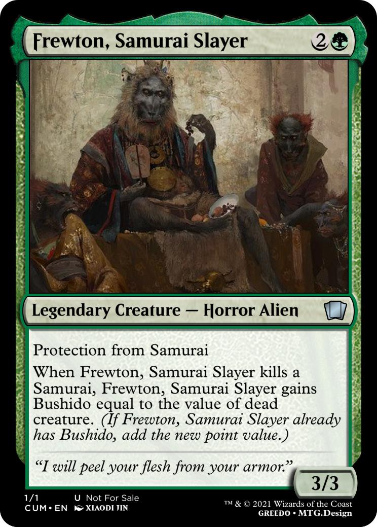 When Frewton, Samurai Slayer kills a Samurai, Frewton, Samurai Slayer gains Bushido equal to the value of dead creature. (If Frewton, Samurai Slayer already has Bushido, add the new point value.)