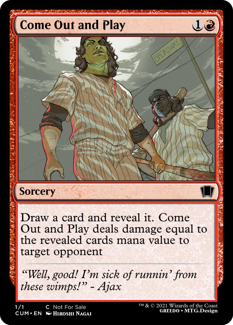 Draw a card and reveal it. Come Out and Play deals damage equal to the revealed cards mana value to target opponent