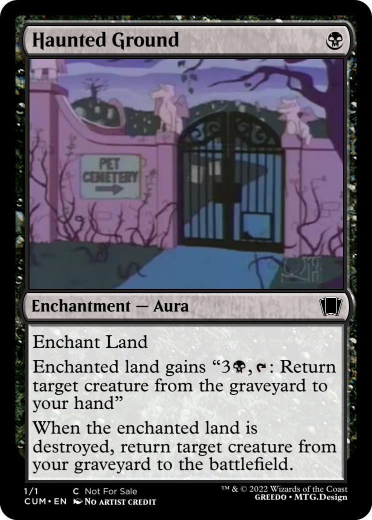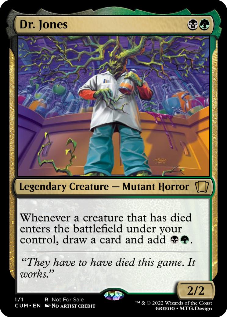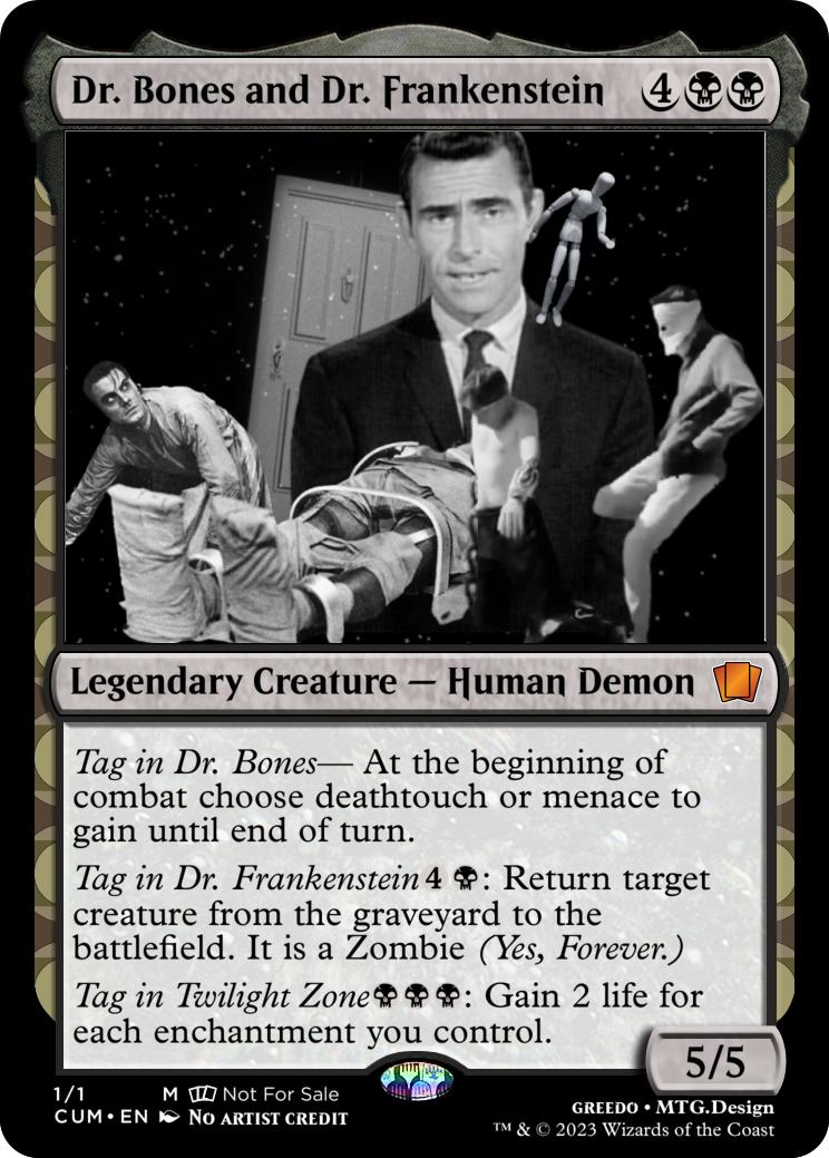 Tag in Dr. Frankenstein{4}{B}: Return target creature from the graveyard to the battlefield. It is a Zombie (Yes, Forever.)