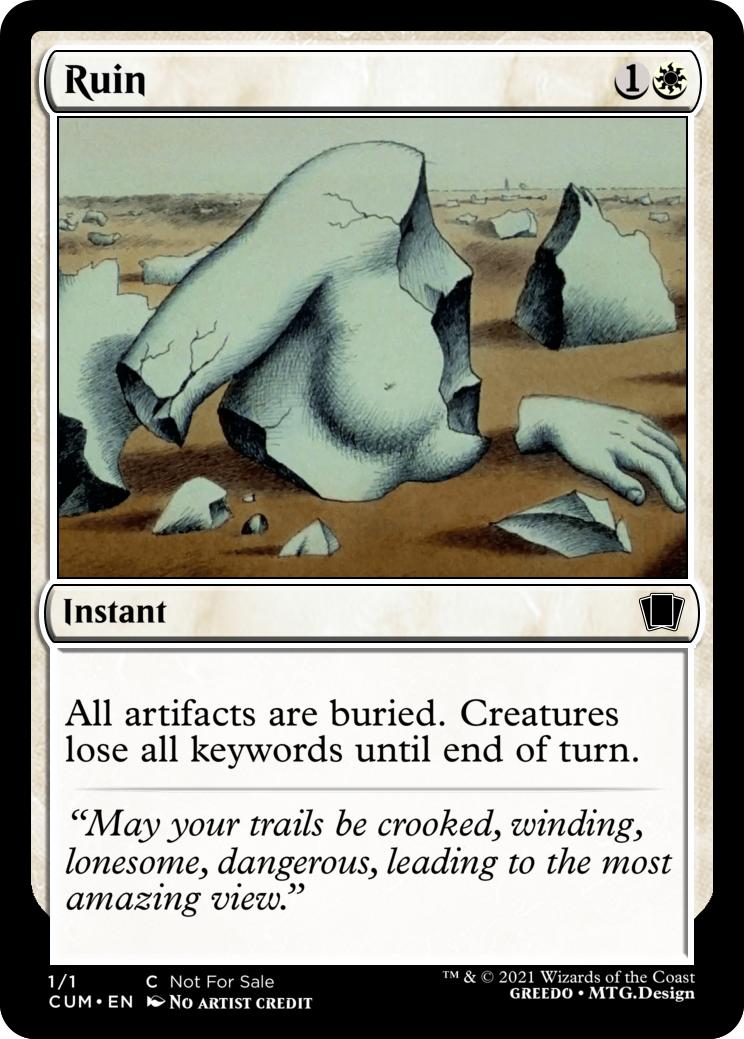 All artifacts are buried. Creatures lose all keywords until end of turn.