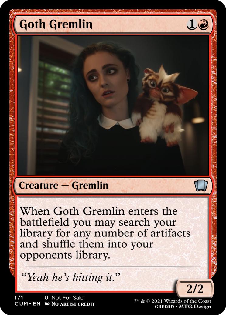 When Goth Gremlin enters the battlefield you may search your library for any number of artifacts and shuffle them into your opponents library.