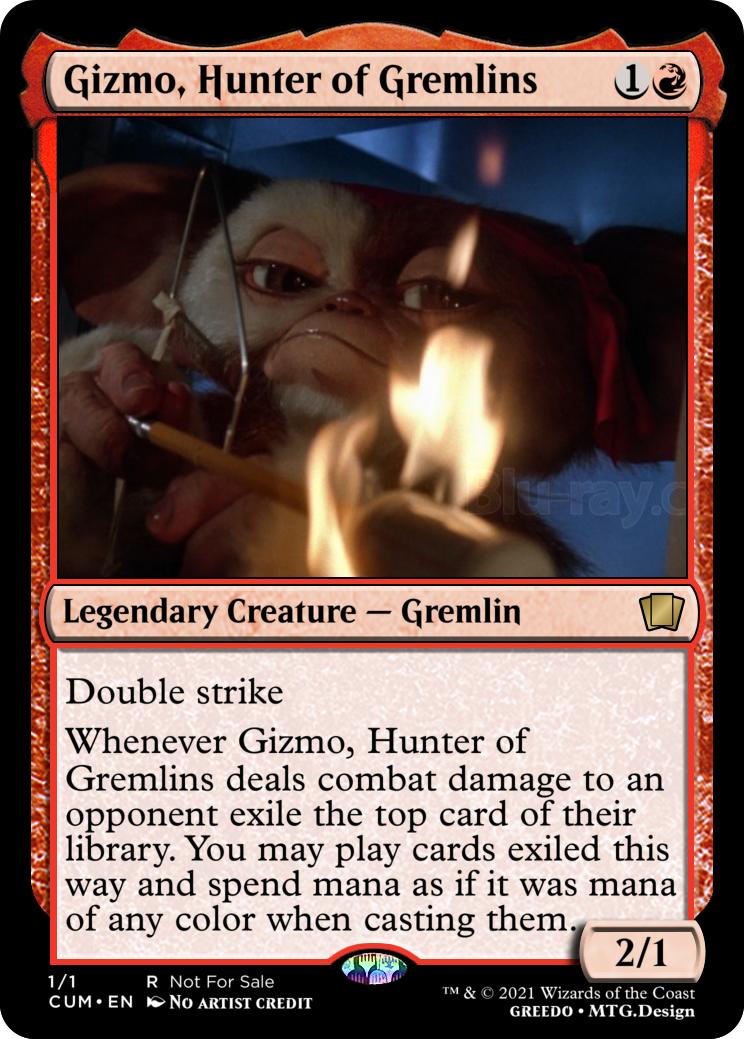 Whenever Gizmo, Hunter of Gremlins deals combat damage to an opponent exile the top card of their library. You may play cards exiled this way and spend mana as if it was mana of any color when casting them.