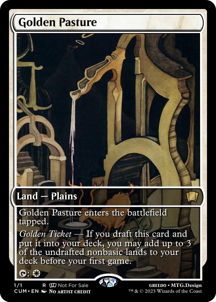 Golden Ticket - If you draft this card and put it into your deck, you may add up to 3 of the undrafted nonbasic lands to your deck before your first game.