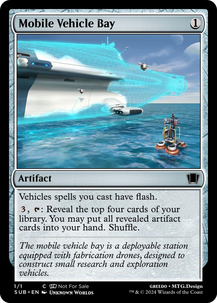 The mobile vehicle bay is a deployable station equipped with fabrication drones, designed to construct small research and exploration vehicles.