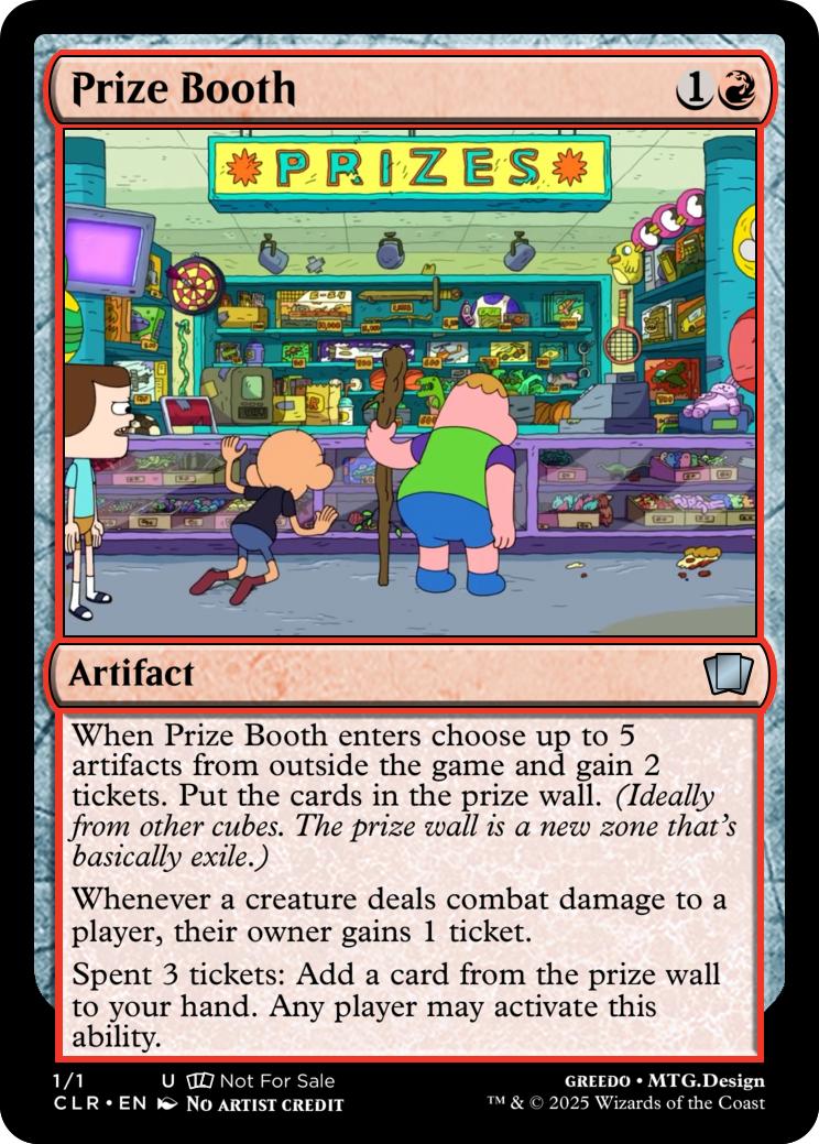When Prize Booth enters choose up to 5 artifacts from outside the game and gain 2 tickets. Put the cards in the prize wall. (Ideally from other cubes. The prize wall is a new zone that's basically exile.)