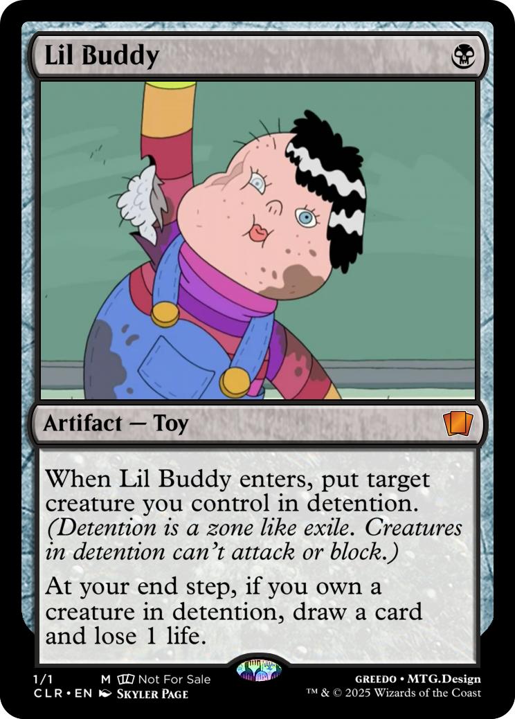 When Lil Buddy enters, put target creature you control in detention. (Detention is a zone like exile. Creatures in detention can't attack or block.)