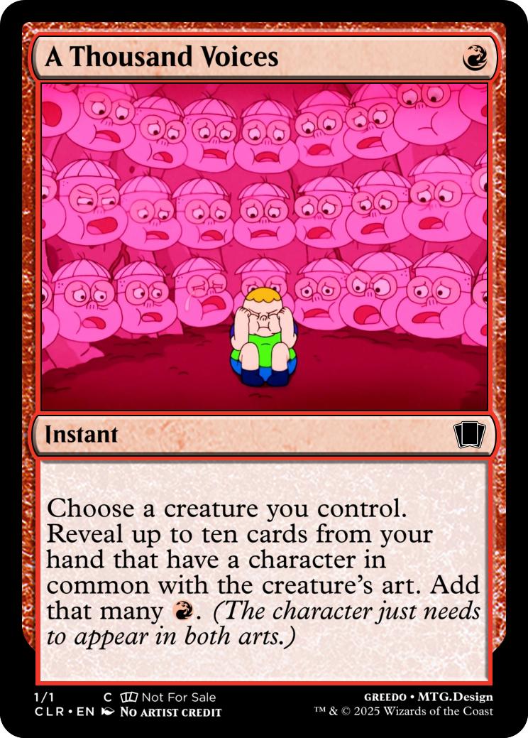 Choose a creature you control. Reveal up to ten cards from your hand that have a character in common with the creature's art. Add that many {r}.(The character just needs to appear in both arts.)