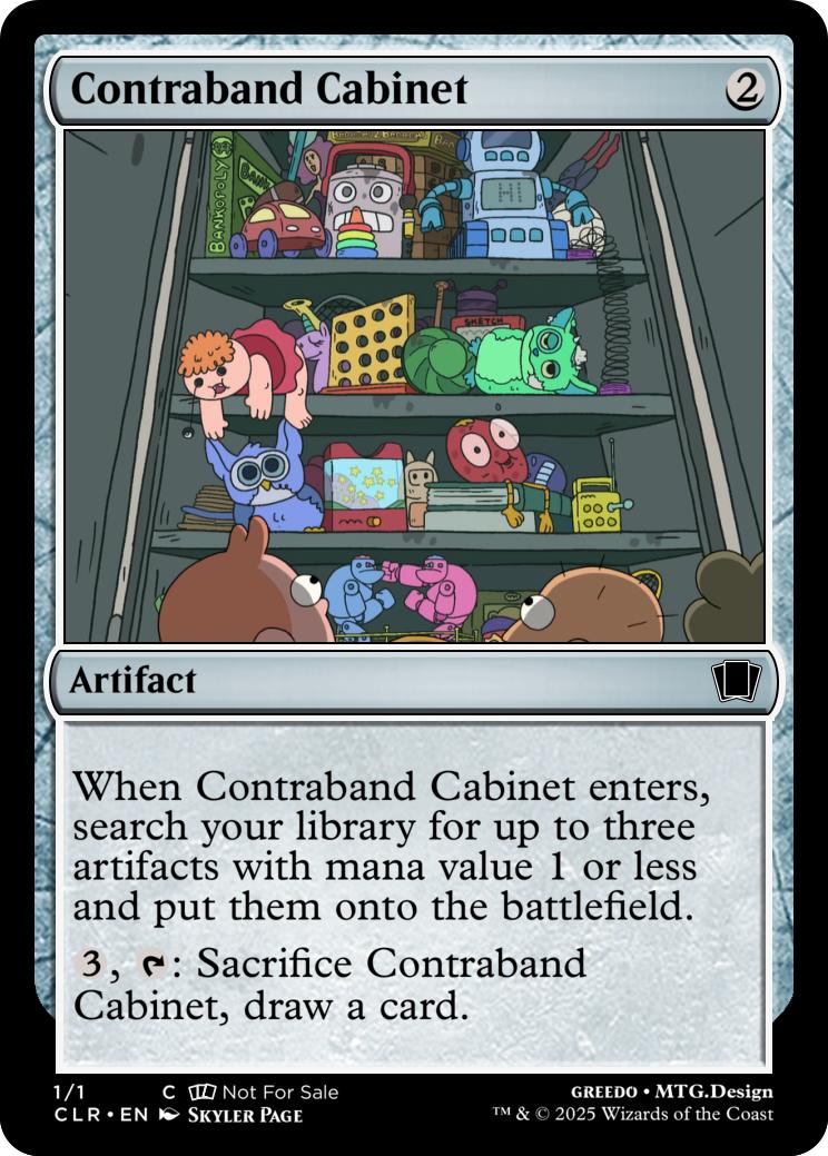 When Contraband Cabinet enters, search your library for up to three artifacts with mana value 1 or less and put them onto the battlefield.