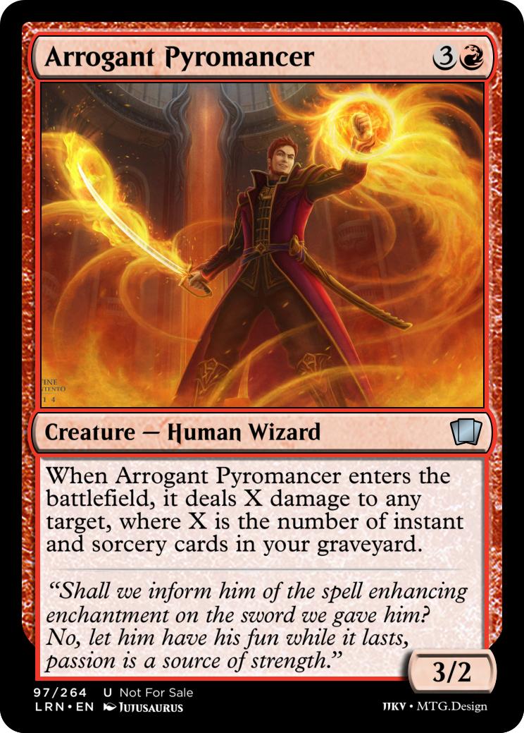 When Arrogant Pyromancer enters the battlefield, it deals X damage to any target, where X is the number of instant and sorcery cards in your graveyard.
