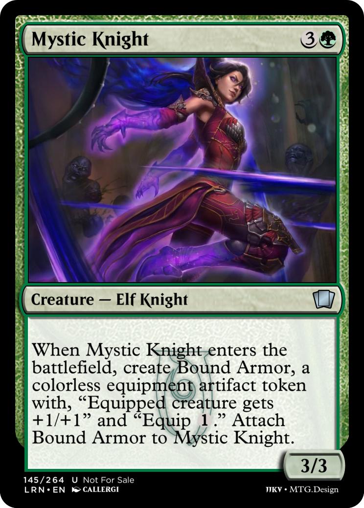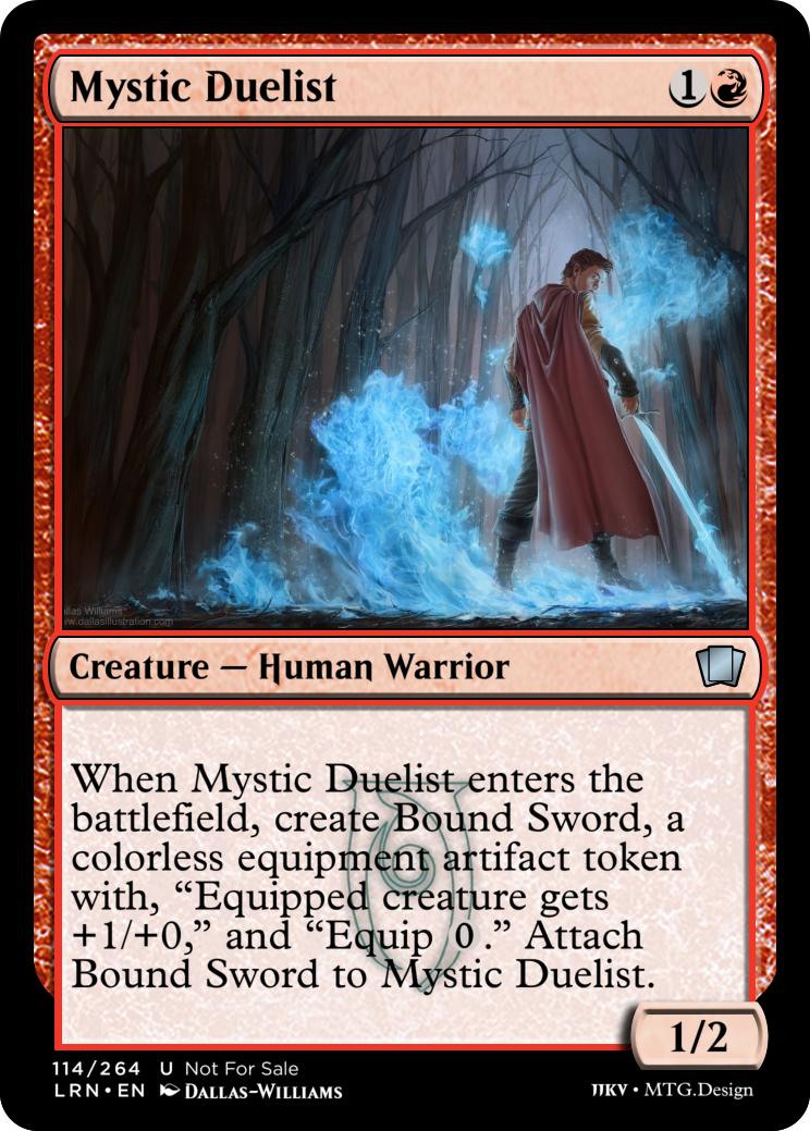 When Mystic Duelist enters the battlefield, create Bound Sword, a colorless equipment artifact token with, "Equipped creature gets +1/+0," and "Equip {0}." Attach Bound Sword to Mystic Duelist.