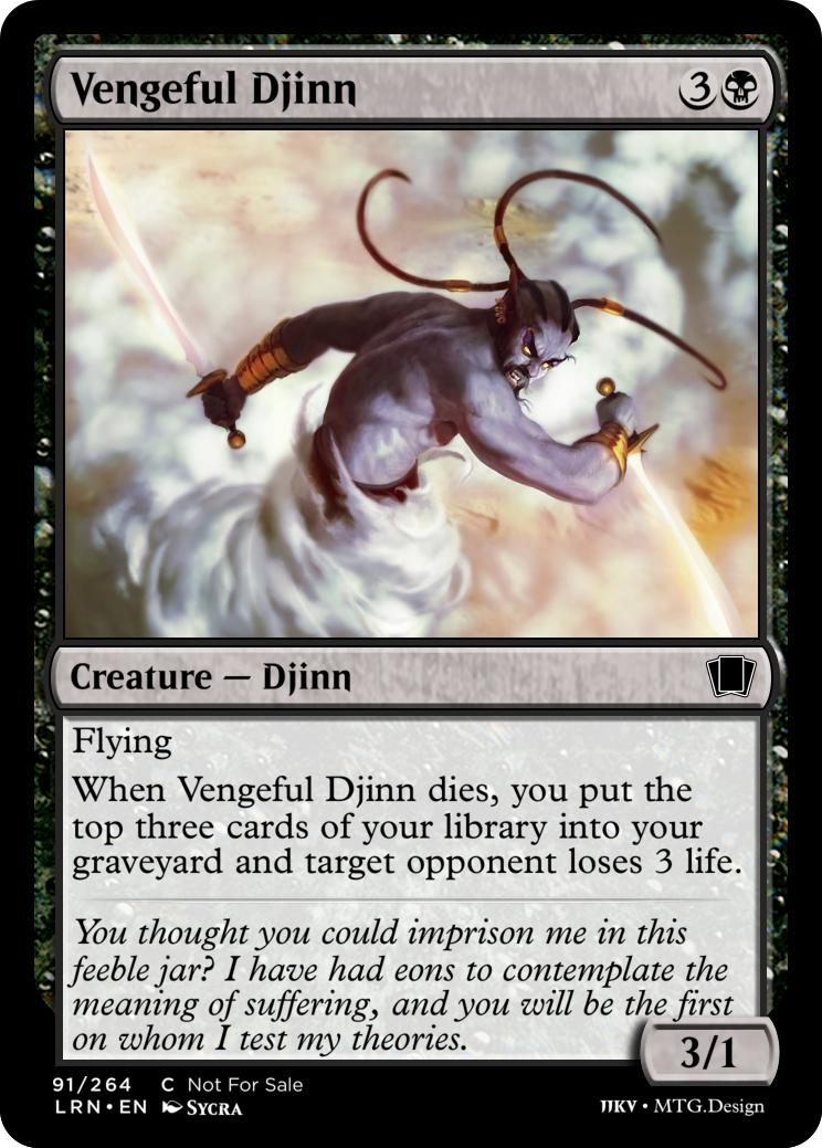 When Vengeful Djinn dies, you put the top three cards of your library into your graveyard and target opponent loses 3 life.