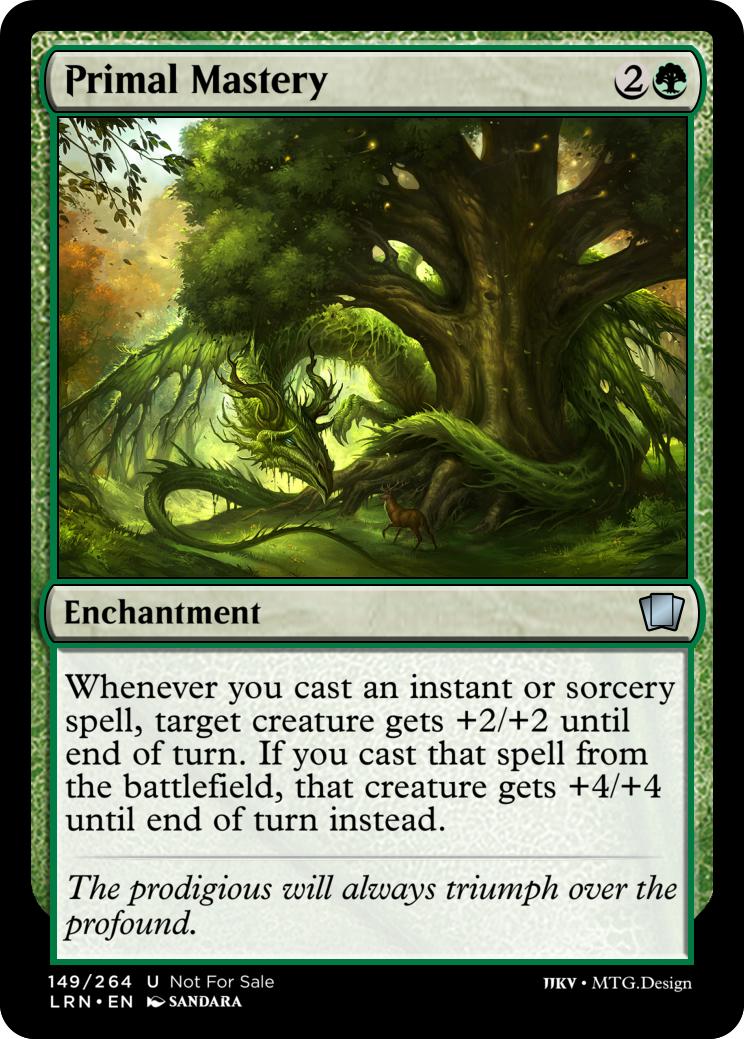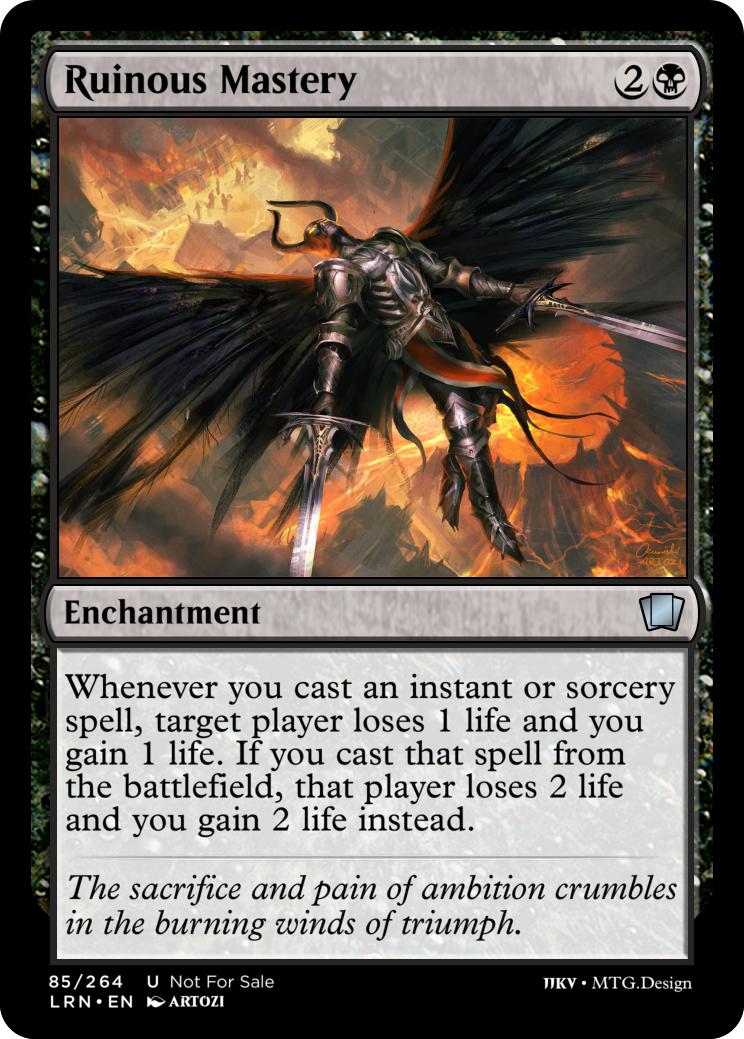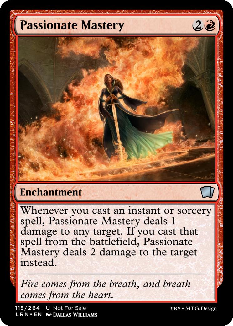Whenever you cast an instant or sorcery spell, Passionate Mastery deals 1 damage to any target. If you cast that spell from the battlefield, Passionate Mastery deals 2 damage to the target instead.