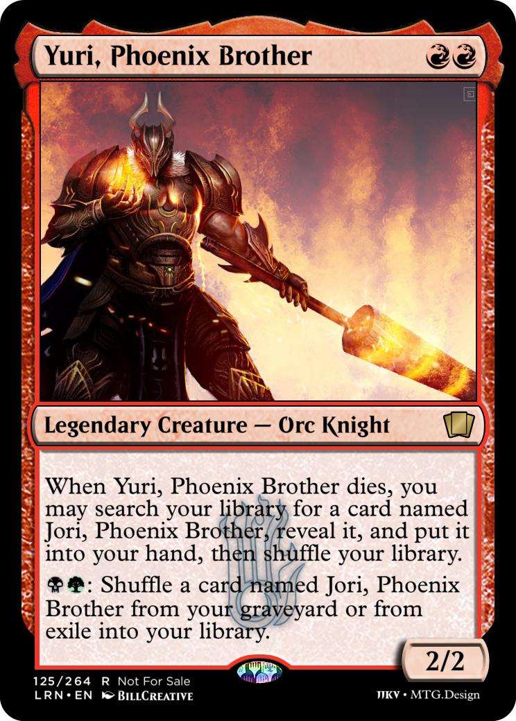 When Jori, Phoenix Brother dies, you may search your library for a card named Yuri, Phoenix Brother, reveal it, and put it into your hand, then shuffle your library.