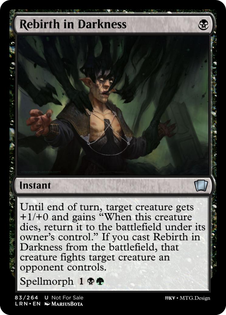 Until end of turn, target creature gets +1/+0 and gains "When this creature dies, return it to the battlefield under its owner's control." If you cast Rebirth in Darkness from the battlefield, that creature fights target creature an opponent controls.