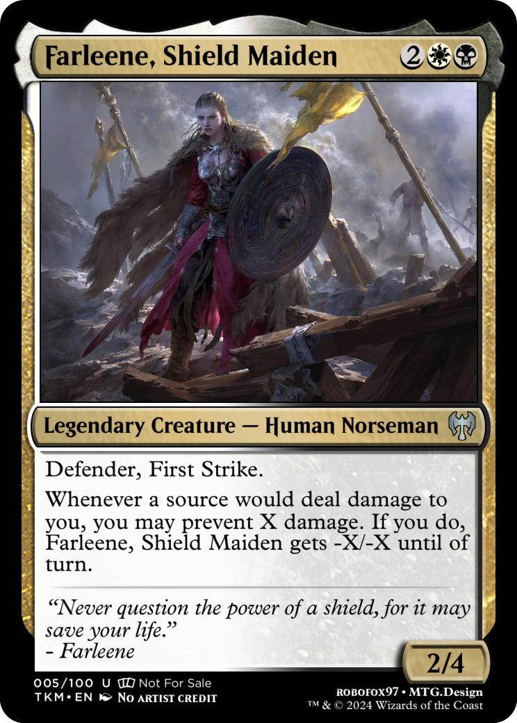 Whenever a source would deal damage to you, you may prevent X damage. If you do, Farleene, Shield Maiden gets -X/-X until of turn.