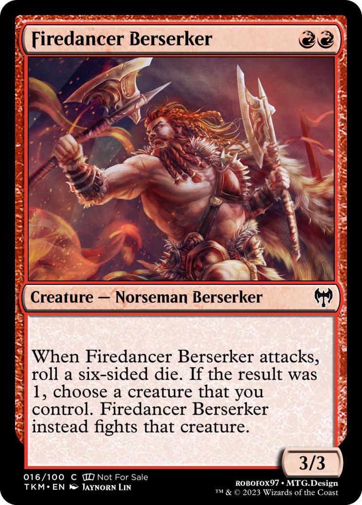 When Firedancer Berserker attacks, roll a six-sided die. If the result was 1, choose a creature that you control. Firedancer Berserker instead fights that creature.