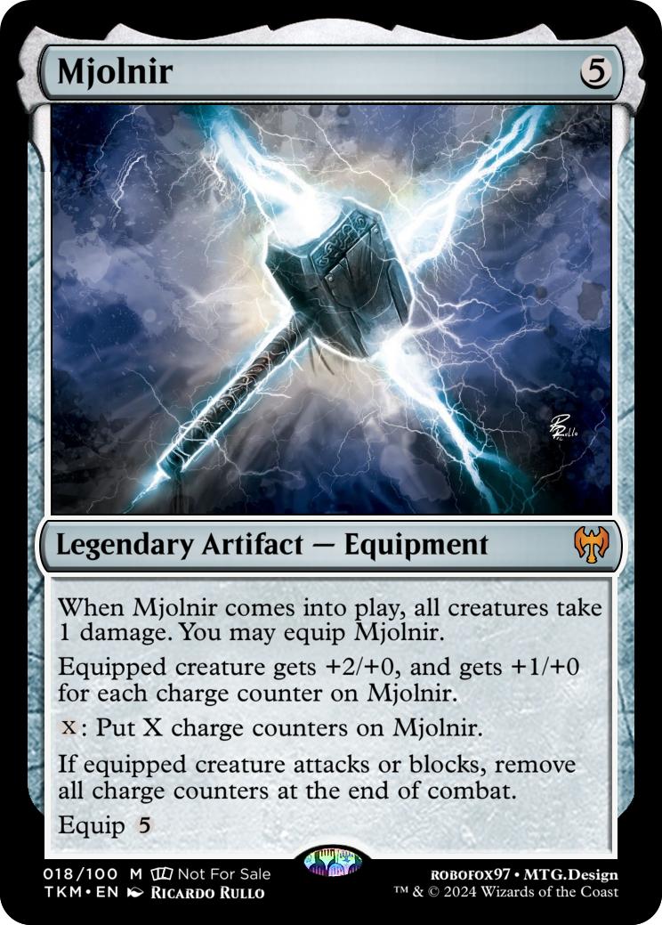 When Mjolnir comes into play, all creatures take 1 damage. You may equip Mjolnir.