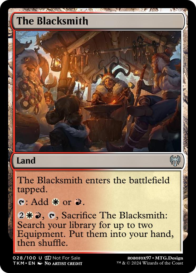 {2}{w}{r}, {t}, Sacrifice The Blacksmith: Search your library for up to two Equipment. Put them into your hand, then shuffle.